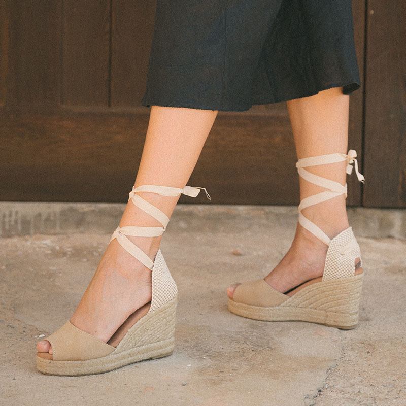 Jute wedge sandal for women made of high quality split leather in brown tone. It ties at the ankle with a beige ribbon and has an opening in the front.