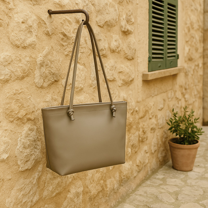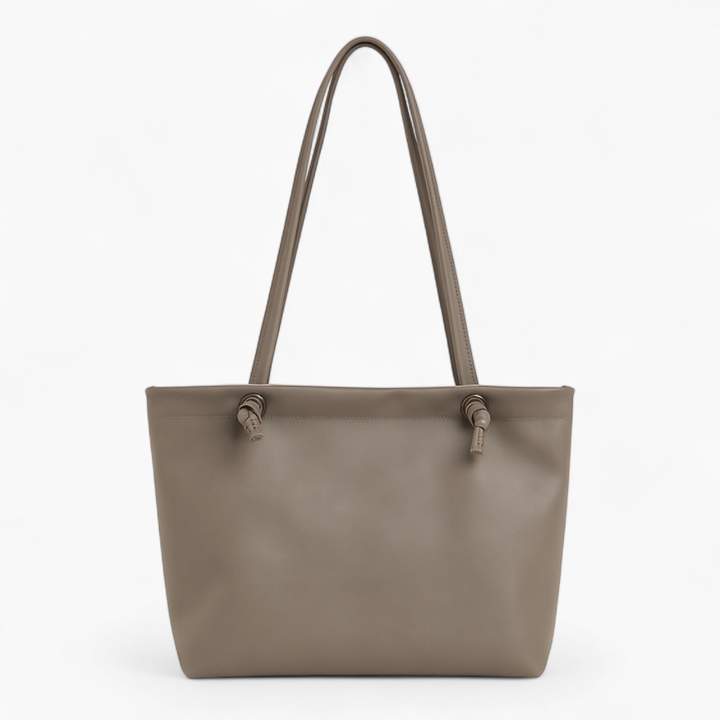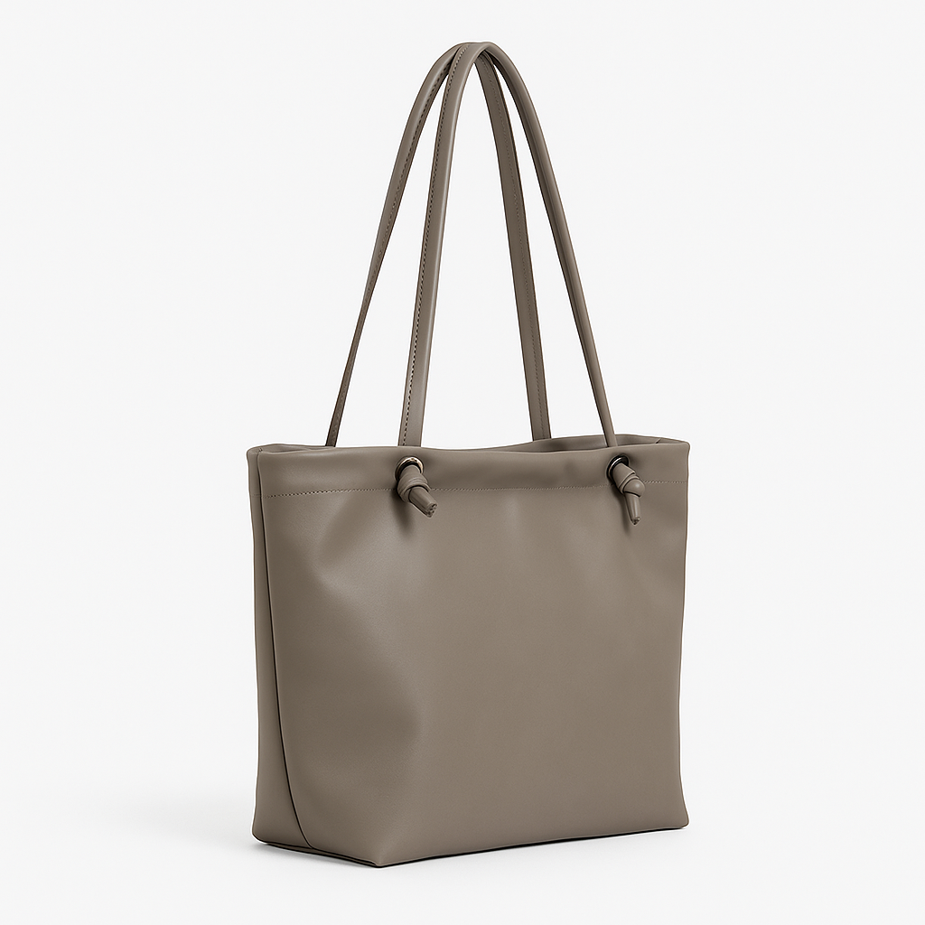 Leather tote bag made of nappa leather in a dark taupe color. Its handles are inserted into the bag through eyelets, making a decorative knot.