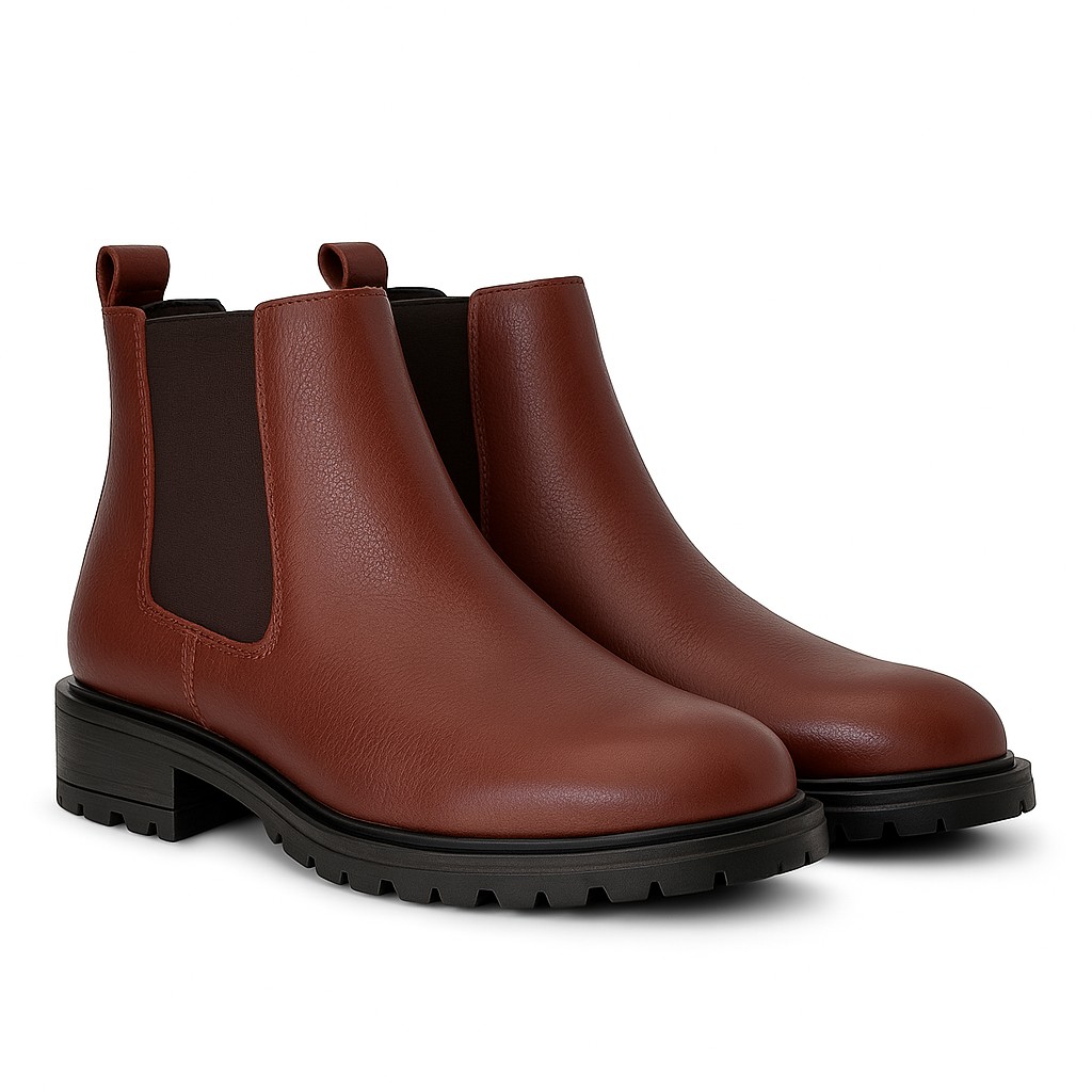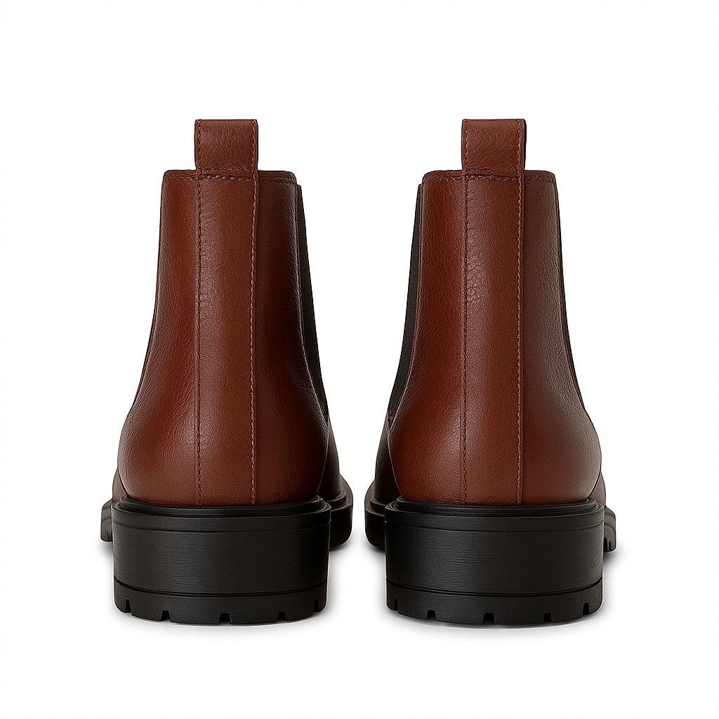 Cognac-colored leather boot with a non-slip black sole and elastic on both sides for greater comfort and elasticity.
