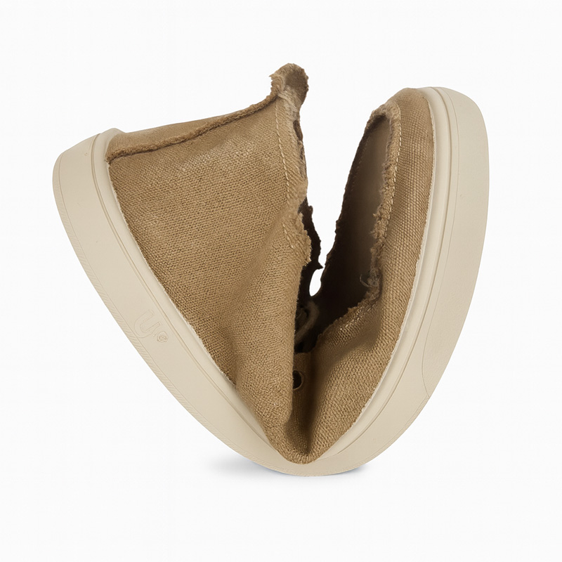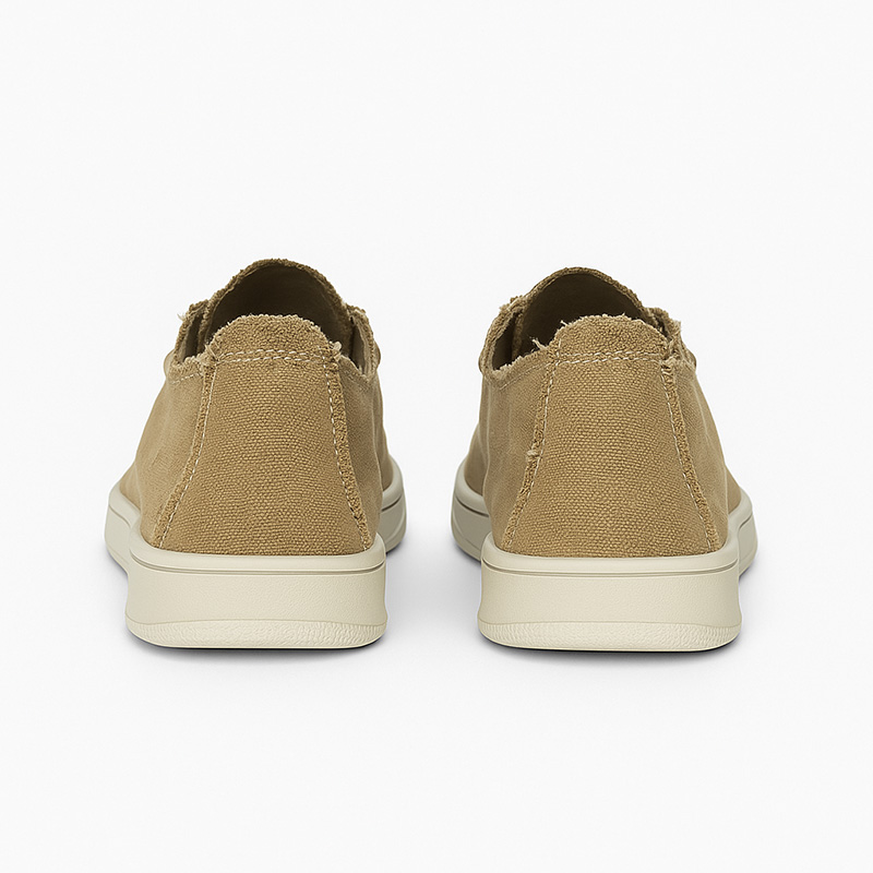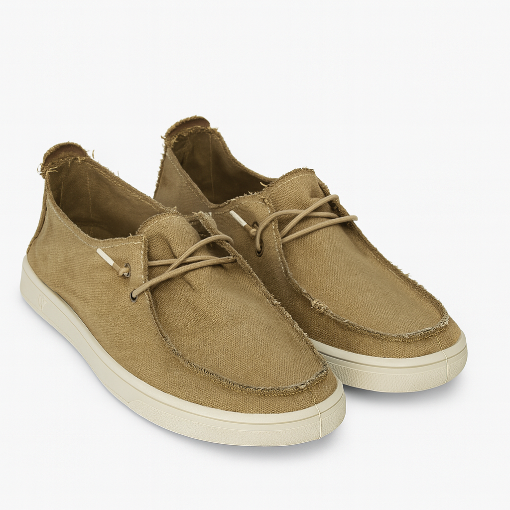 Men’s nautical style shoes made of beige fabric with elastic laces and a non-slip white rubber sole.