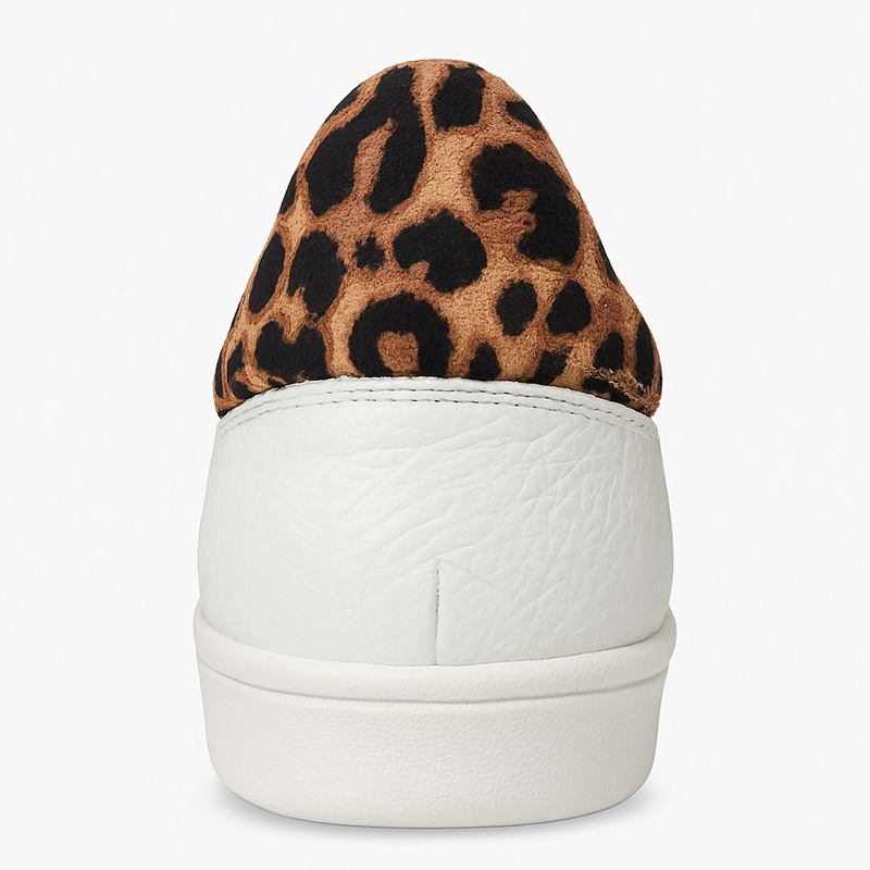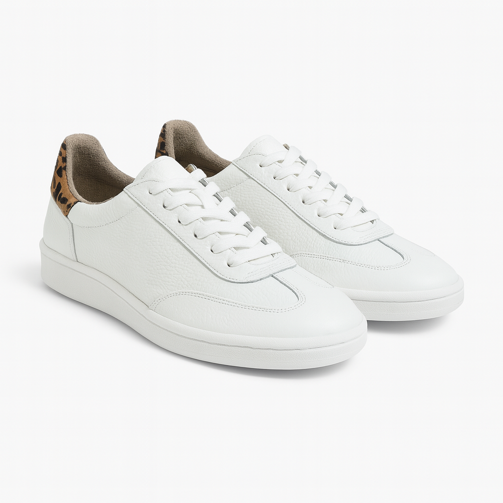 White nappa leather sneaker, made in Spain. White laces and animal print details on the heel and tongue.